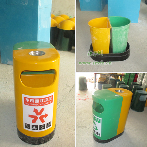環(huán)保分類玻璃鋼垃圾桶 學(xué)校的首選深圳寶安沙井實(shí)驗(yàn)學(xué)校,是欣方圳老顧客了。按照之前訂購的玻璃鋼垃圾桶樣板生產(chǎn),發(fā)實(shí)物照給工廠的廠長確認(rèn)。A21玻璃鋼環(huán)保分類垃圾桶的規(guī)格為:680*400*850mm.這款垃圾桶來頭可不小哦,它是獲得了專利外觀設(shè)計(jì)的玻璃鋼垃圾桶。每個(gè)產(chǎn)品是經(jīng)過的嚴(yán)格生產(chǎn)程序制造出來,貼上產(chǎn)品合格證,符合企業(yè)高品質(zhì)標(biāo)準(zhǔn)。玻璃鋼垃圾桶一邊嫩綠,一邊中絡(luò)黃,底座黑色,外加一個(gè)煙灰缸巧妙的搭配,簡潔、美觀。桶蓋/桶身采用FRP玻璃鋼復(fù)合材料制造,具有防腐、防盜、防生銹、易清潔等特點(diǎn),表面涂層采用高分子耐老化膠衣涂層,色澤明快、持久。